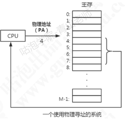 计算机里面的内存叫做主存,硬盘叫做辅存。主存可看作一个很长的数组,一个字节一个单元,每个字节有一个唯一的地址,这个地址叫做物理地址(Physical Address)。早期的计算机中,如果CPU需要内存,使用物理寻址,直接访问主存储器。
