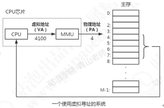 所以想了一个办法,在CPU和主存之间增加一个中间层。CPU不再使用物理地址访问主存,而是访问一个虚拟地址,由这个中间层把地址转换成物理地址,最终获得数据。这个中间层叫做MMU(Memory Management Unit),内存管理单元。