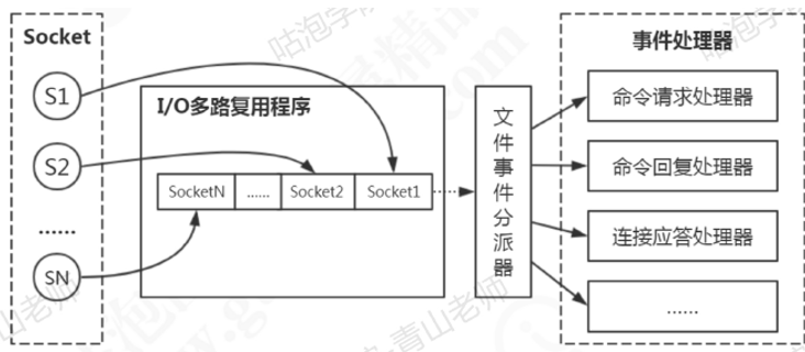 它的基本原理就是不再由应用程序自己监视连接,而是由内核替应用程序监视文件描述符。客户端再操作的时候,会产生具有不同事件类型的socket。在服务端,IO多路复用程序(IO Multiplexing Module)会把消息放入队列中,然后通过文件事件分派其(File event Dispatcher),转发到不同的事件处理器中。