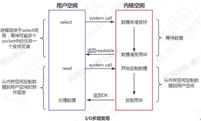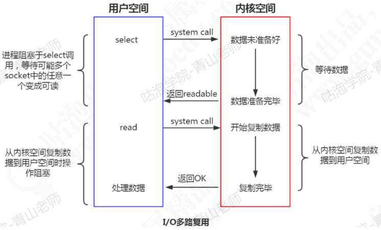 多路复用有很多实现,以select为例,当用户进程调用了多路复用器,进程会被阻塞。内核会监视多路复用器负责的所有socket,当任何一个socket的数据准备好了,多路复用器就会返回。这时候用户进程再调用read操作,把数据从内核缓冲器拷贝到用户空间。