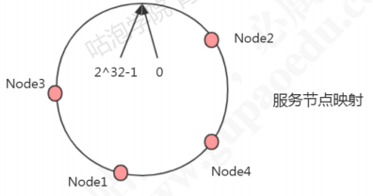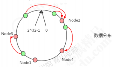 原理:把所有的哈希值空间组织成一个虚拟的圆环(哈希环),整个空间按顺时针方向组织。因为是环形空间,0和2^32-1是重叠的。假如有四台机器要哈希环来实现映射(分布数据),先根据机器的名称或者ip计算哈希值,然乎分布到哈希环中(红色圆圈)。