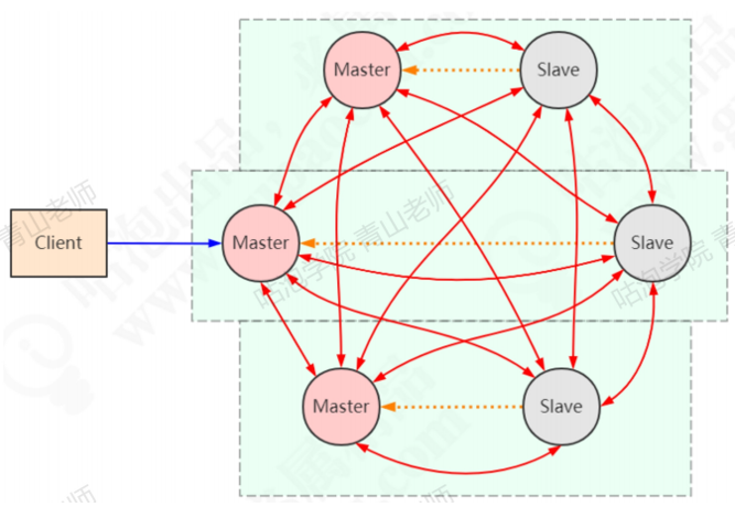 Redis Cluster可以看成是由多个Redis实例组成的数据集合。客户端不需要关注数据到底存储在哪个节点,只需要关注这个集合整体。以3主3从为例,节点之间两两交互,共享数据分片,节点状态等信息。
