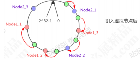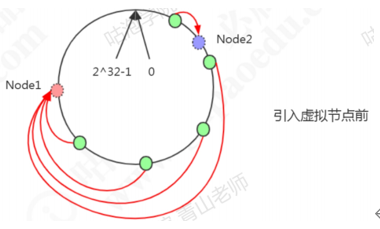 Node1设置了两个虚拟节点,node2也设置了两个虚拟节点(虚线圆圈)。这时候有3条数据分布到了node1,1条数据分布到了node2。