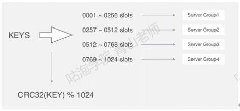 分片原理:Codis把所有的key分成了N个槽(例如1024),每个槽对应一个分组,一个分组对应于一个或者一组Redis实例。Codis对key进行CRC32运算,得到一个32位的数字,然后模拟N(槽的个数),得到余数,这个就是key对应的槽,槽后面就是redis实例(跟Mycat的先哈希后范围的算法思想类似)。比如4个槽: