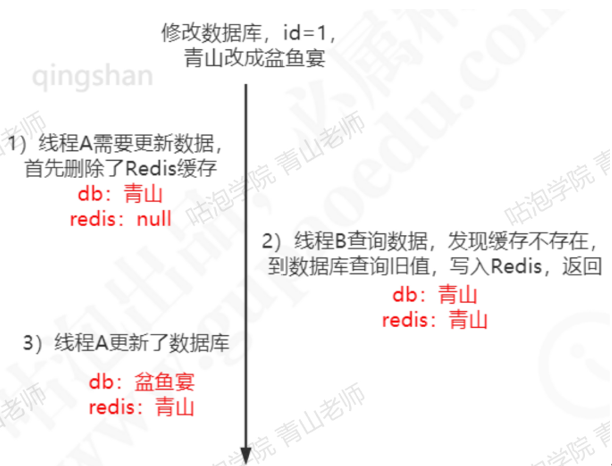 这个时候,redis 是旧值,数据库是新的值,发生了数据不一致的情况。