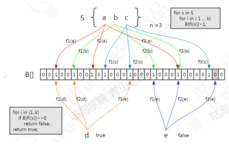 再来看另一个元素,e元素。要判断它在容器中是否存在,一样的要用这三个函数去计算。第一个位置是1,第二个位置是1,第三个位置是0。E元素是不是一定不在这个容器中呢?可以确定一定不存在,如果说但是已经把e元素存到布隆过滤器中去了,那么这三个位置肯定是1,不会出现0.