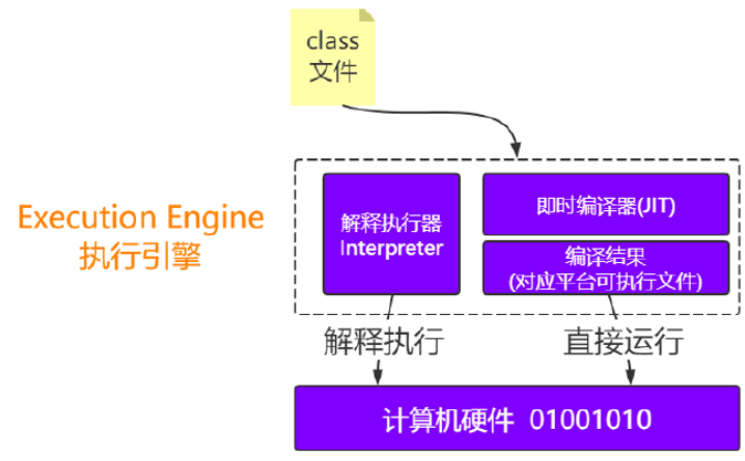 最终JVM需要把字节码指令转换为机器码,可以理解为是0101这样的机器语言,这样才能运行在不同的机器上,那么由字节码转变为机器码是谁来做的呢?说白了就是谁来执行这些字节码指令的呢?这就是执行引擎。
