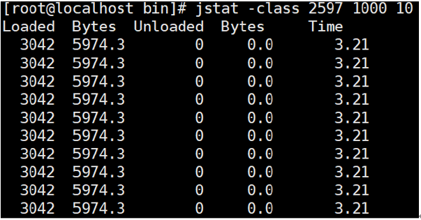 jstat -class PID 1000 10 查看某个java进程的类装载信息,每1000毫秒输出一次,共输出10次