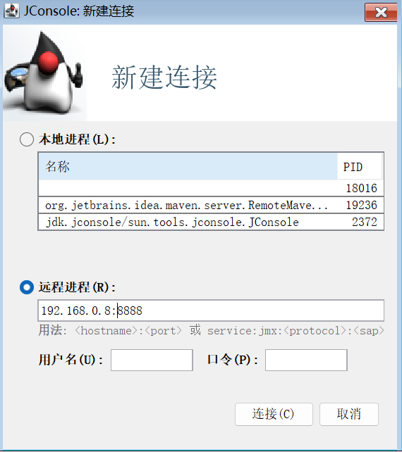 (4)打开本地jconsole,连接指定JMX的ip和port:192.168.0.8:8888