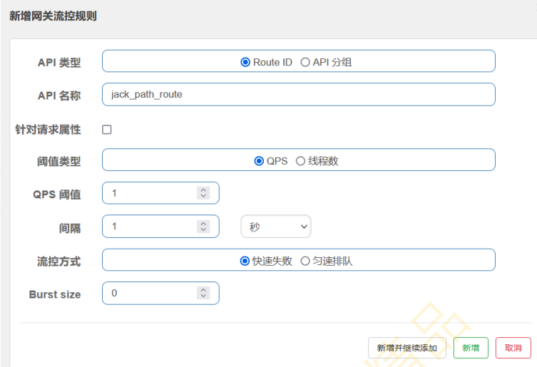 就是相当于对jack_path_route这个route id对应的微服务进行限流,不管访问lb://order的哪个资 源,都会使用该限流规则