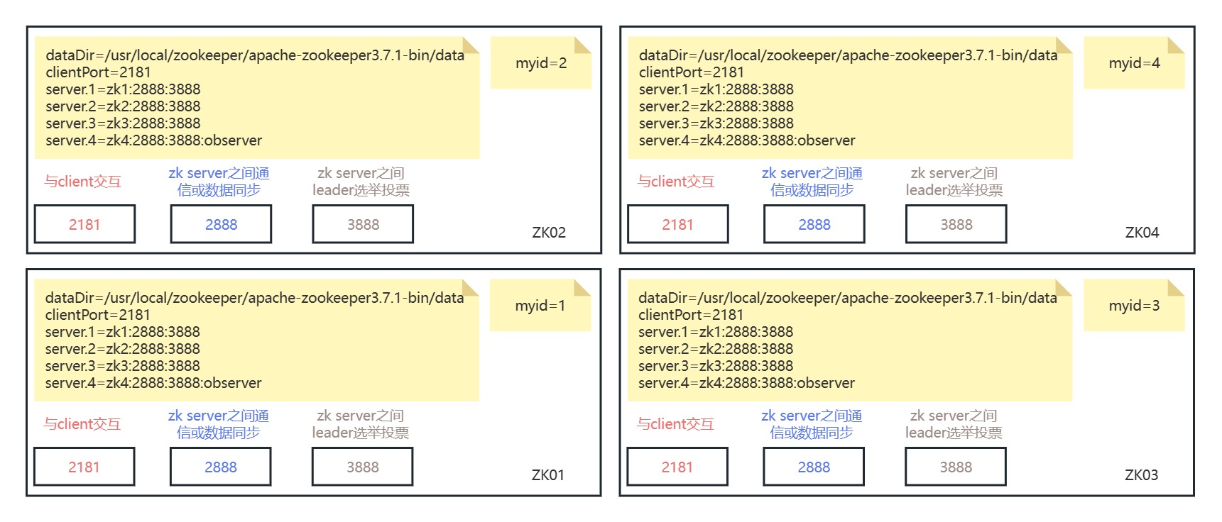 | zk01 192.168.0.111 zk02 192.168.0.112 zk03 192.168.0.113 zk04 192.168.0.114 observer