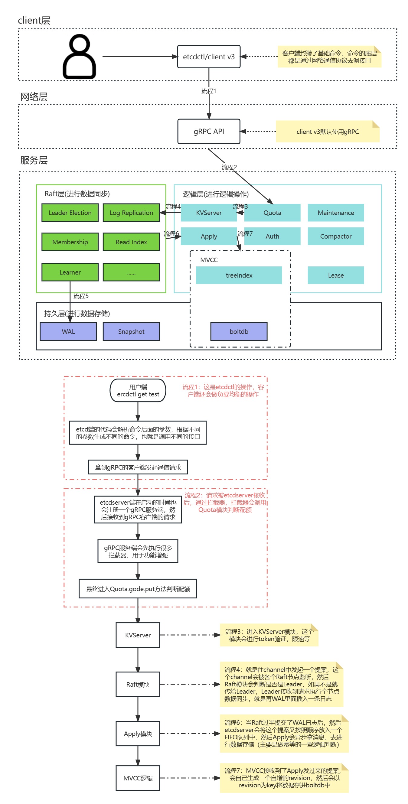 流程2:etcd服务端中的拦截器接收请求,先做配额限制