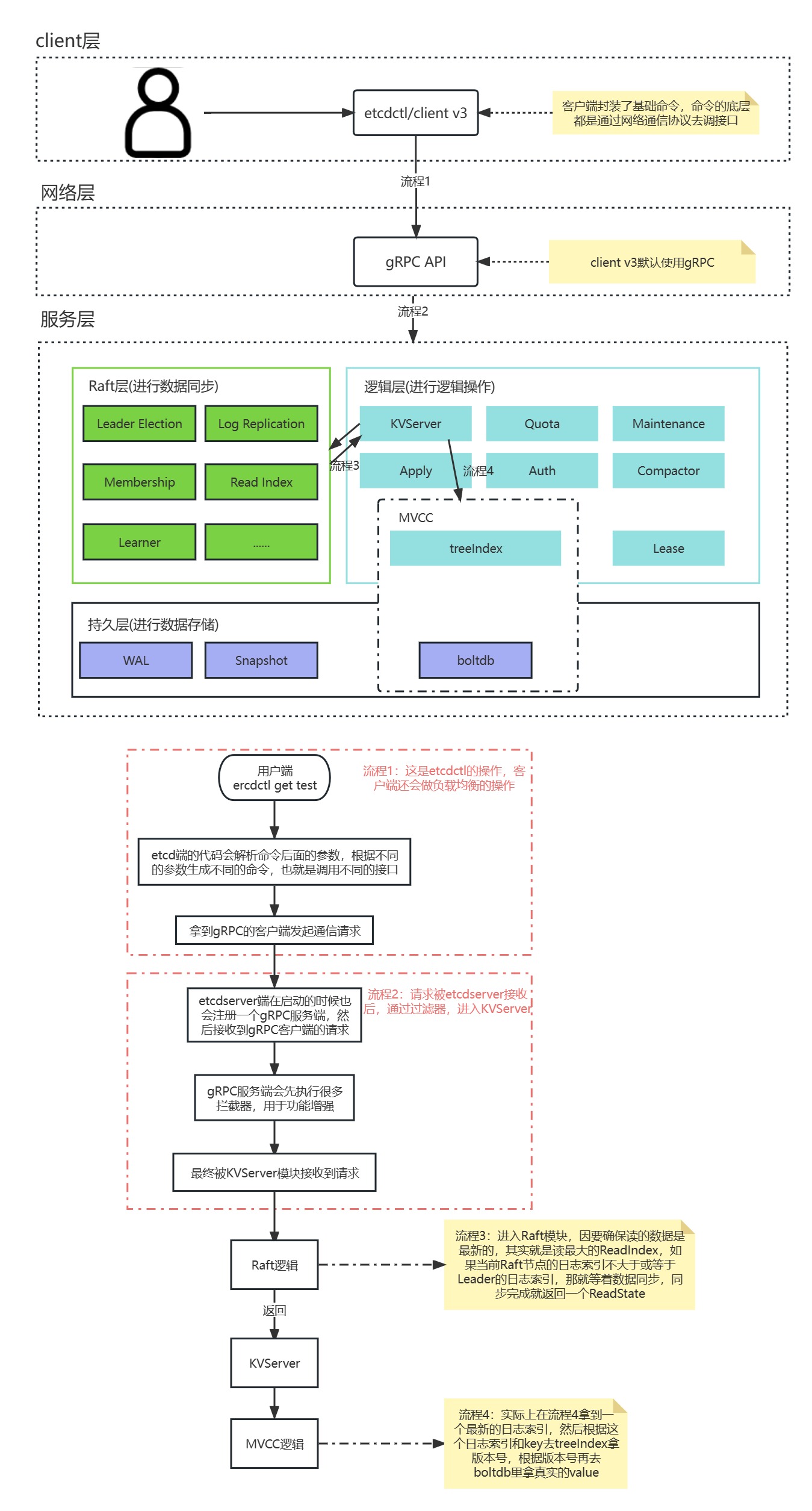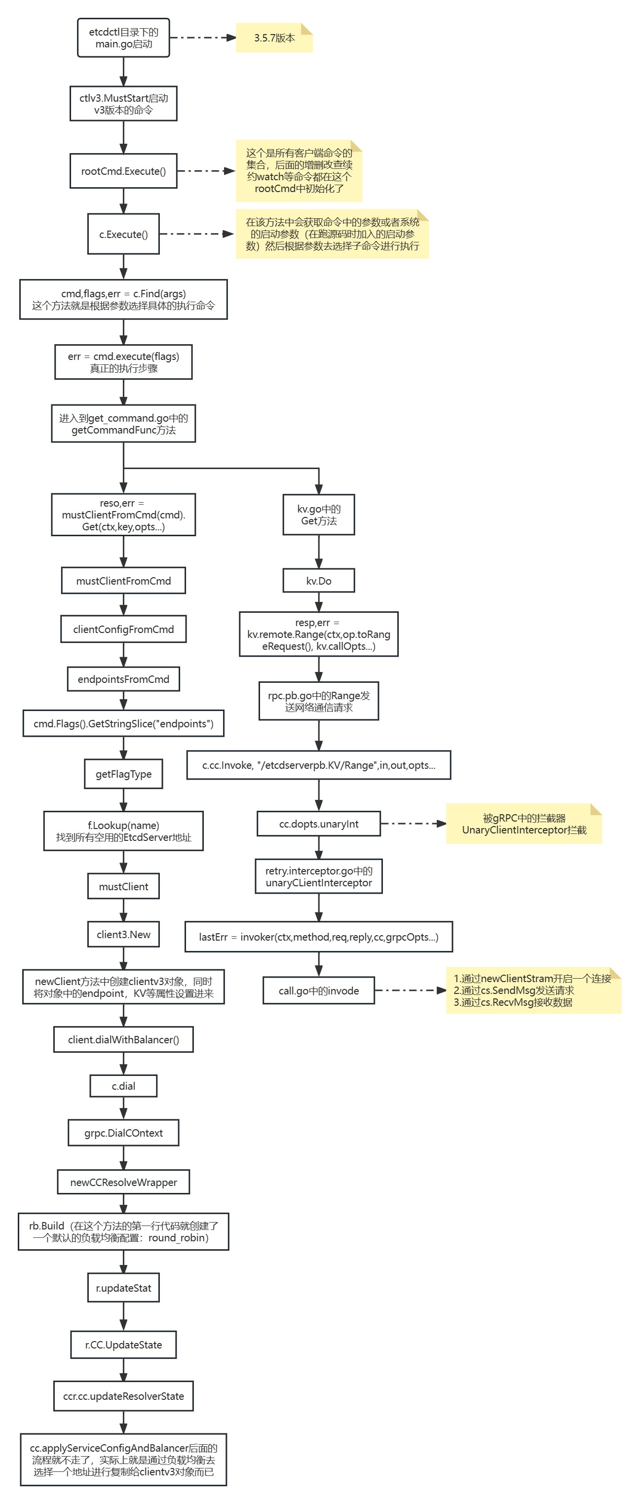 流程1:etcd客户端发起一个get请求,这个 请求底层是基于gRPC完成的
