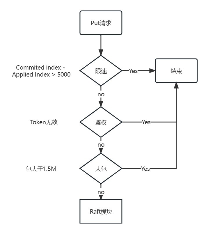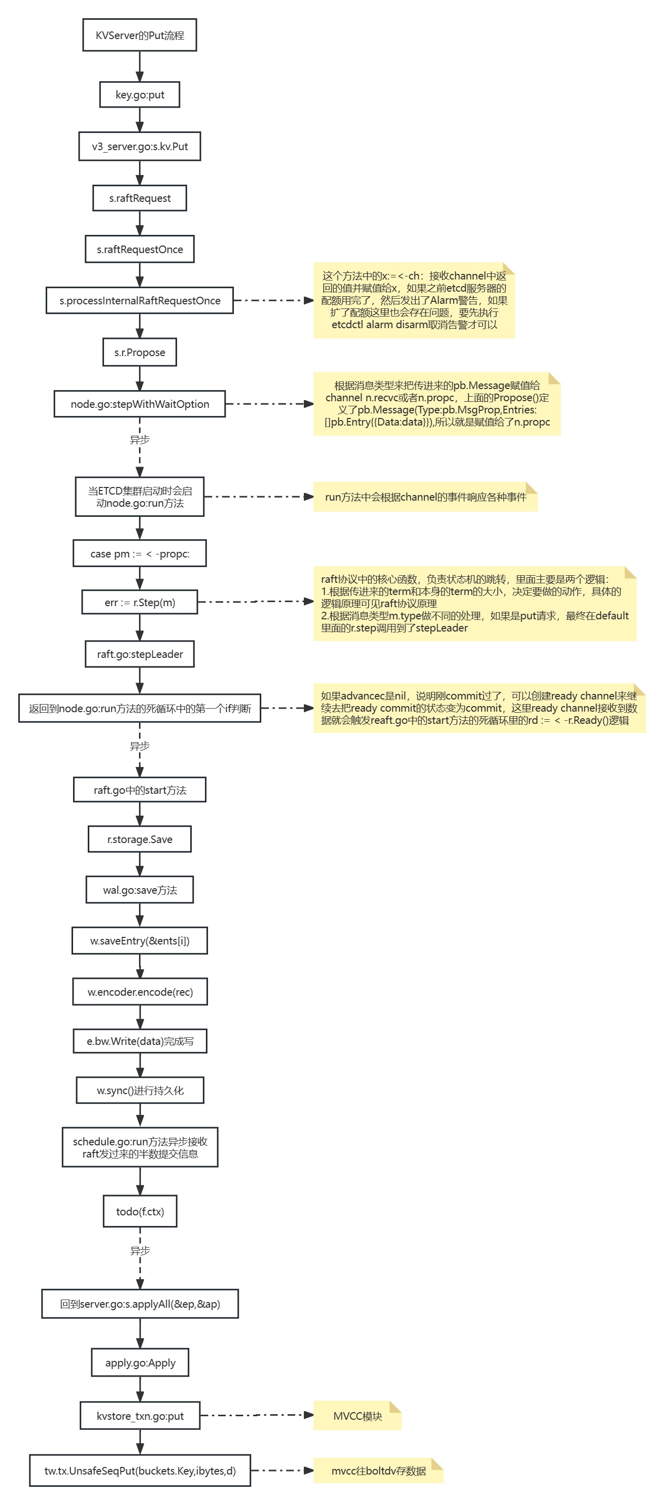 ⚫ 前置开启服务以及各种携程,并注册拦截器,调Quota进行配额限制、然后调KVServer进行限流、 校验、限制大小等操作 ⚫ 走Raft模块,保证各节点数据同步 ⚫ 收到各节点同步日志成功通知则走Apply模块,进行幂等性判断 ⚫ 走MVCC模块保存不同版本的KV