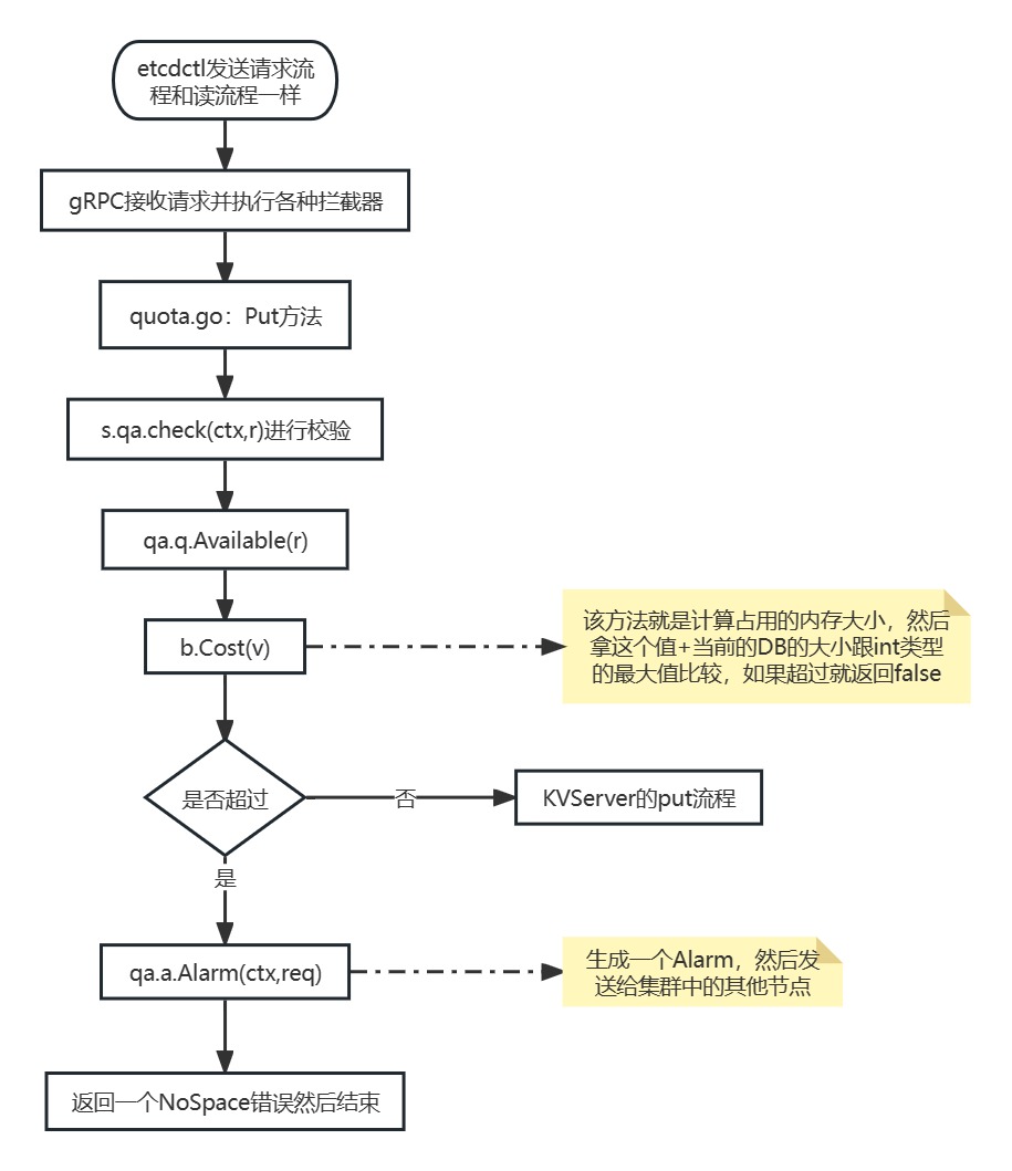 流程2:etcd服务端中的拦截器接收请求,先做配额限制