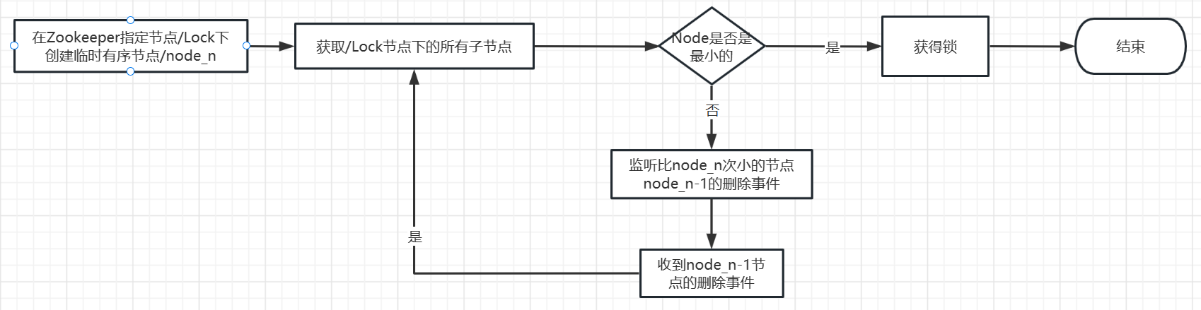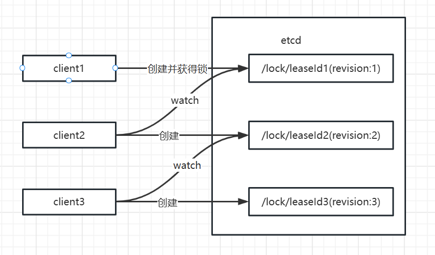 客户端以前缀 /lock/ 读取 keyValue 列表(keyValue 中带有 key 对应的 Revision), 判断自己 key 的 Revision 是否为当前列表中最小的,如果是则认为获得锁;否则监听列 表中前一个 Revision 比自己小的 key 的删除事件,一旦监听到删除事件或者因租约失效 而删除的事件,则自己获得锁。