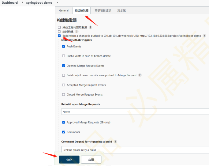 (2)打开jenkins中springboot-demo pipeline,构建触发器,记录下触发器的地址:http://192.168.0.53:8888/project/springboot-demo