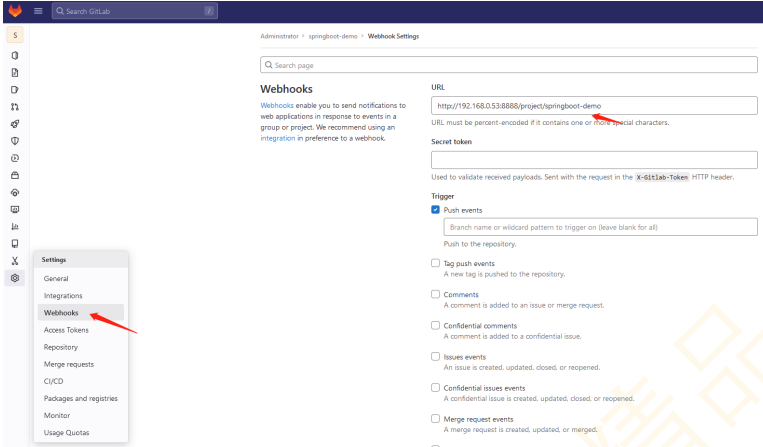 (3)在gitlab上配置webhook的地址,即jenkins对应的触发器地址: http://192.168.0.53:8888/project/springboot-demo,然后点击下方的“Add webhook”