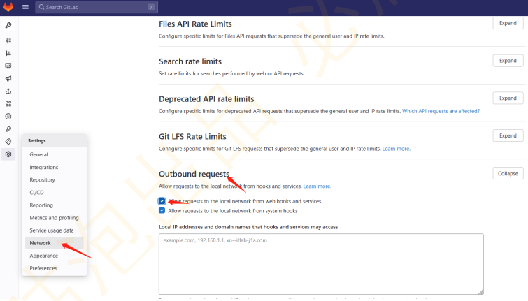 (4)当提示“Url is blocked: Requests to the local network are not allowed”,需要做一下设置,以 root账号登录gitlab,然后再配置一下第(2)步