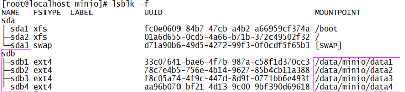 | mount /dev/sdb1 /data/minio/data1 mount /dev/sdb2 /data/minio/data2 mount /dev/sdb3 /data/minio/data3 mount /dev/sdb4 /data/minio/data4