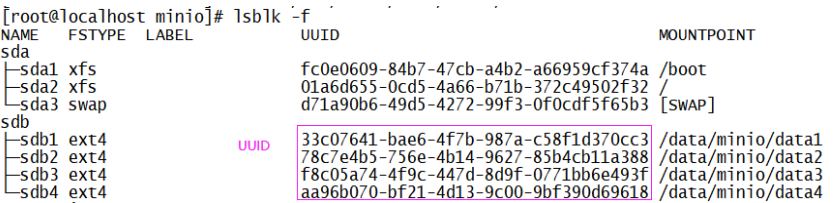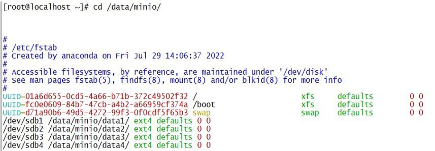 /dev/sdb1 /data/minio/data1/ ext4 defaults 0 0 /dev/sdb2 /data/minio/data2/ ext4 defaults 0 0 /dev/sdb3 /data/minio/data3/ ext4 defaults 0 0 /dev/sdb4 /data/minio/data4/ ext4 defaults 0 0