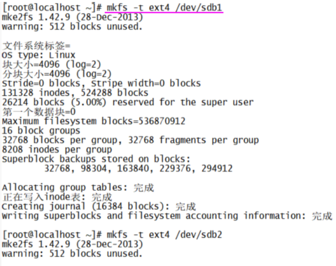 | mkfs -t ext4 /dev/sdb1 mkfs -t ext4 /dev/sdb2 mkfs -t ext4 /dev/sdb3 mkfs -t ext4 /dev/sdb4