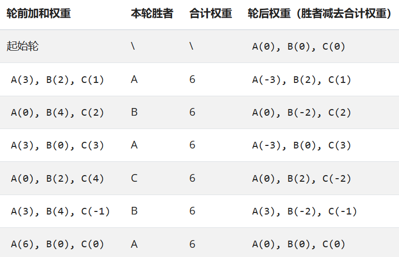 对此,Dubbo 借鉴 Nginx 的平滑加权轮询算法,对此做了优化,调用过程可抽象成下表: