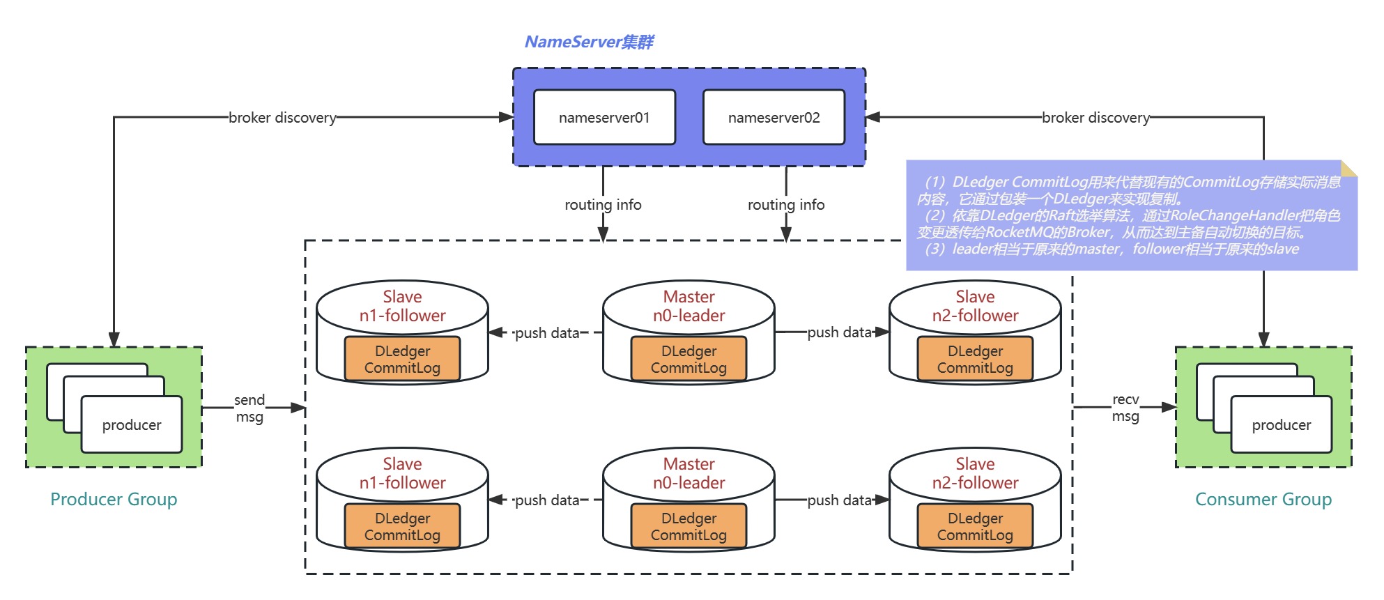 DLedger,它是基于RAFT协议的commitlog存储库,解决了自动选举brokermaster和日志复制的问题。