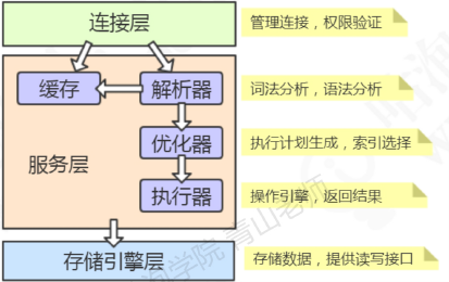 连接层会把SQL语句交给服务层,这里面又包含一系列流程:比如查询缓存的判断,根据SQL调用相应的接口,对我们的SQL语句进行次发和语法的解析,比如关键字怎么识别,语法有没有错误等等。