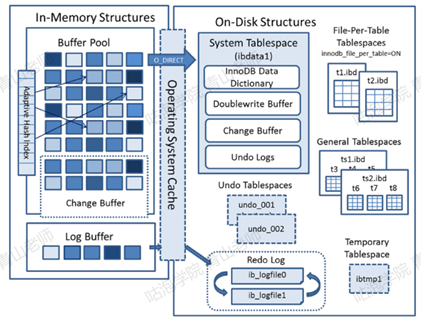 主要分为三个部分:Buffer Pool,Change Buffer,Adaptive Hash Index,(redo)log buffer。