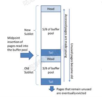 所有新数据加入到buffer pool时一律先放到冷区的head。如果有些预读的数据没有被用到,会在冷区直接被淘汰。放到冷区后如果再次被访问,都会把它移动到热区的head。如果热区的数据长时间没有被访问,会被先移动到冷区的head部,最后慢慢在tail淘汰。默认情况下,热区占了5/8的大小,冷区占了3/8,这个值由innodb_old_blocks_pct控制,它代表的是old区的大小,默认是37%也就是3/8. Innodb_old_blocks_pct的值可以调整,在5%到95%之间,这个值越大,new区越小,这个LRU算法越接近传统的LRU。如果这个值太小,old区没有被访问的速度淘汰会更快。
