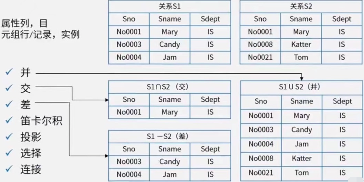 并(∪): 关系R与S的并是由属于或属于S的元组构成的集合。