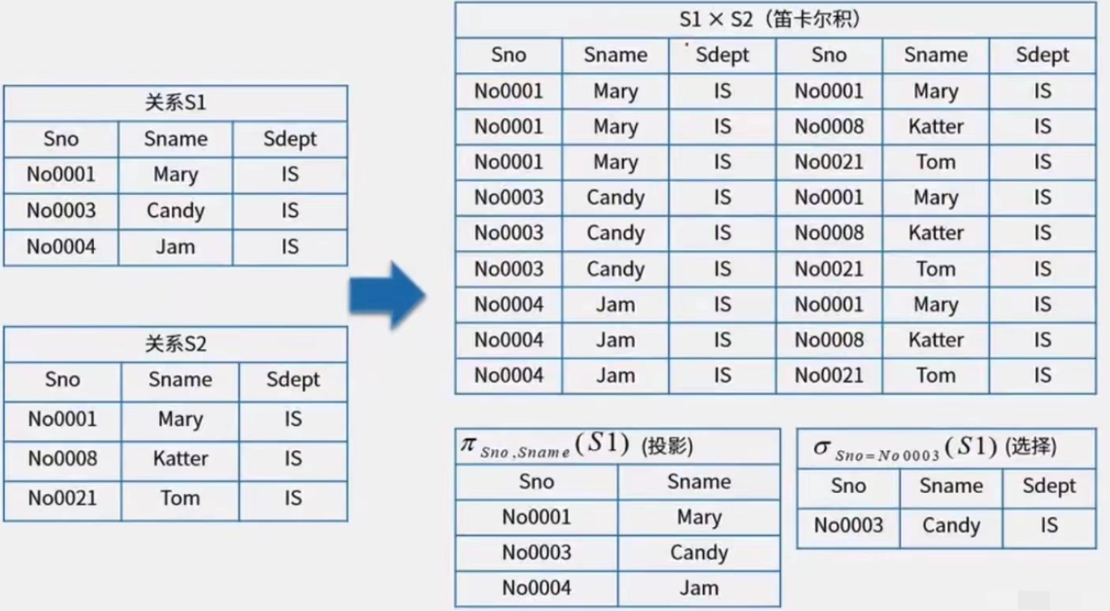 笛卡尔积(X): 两个关系分别为n列和m列的关系R和S的笛卡尔积是一个(n + m)列的元组的集合。其中的前n列是关系R的一个元组,后m列是关系S的一个元组,记作R X S,如果R和S有相同的属性名,可在属性名前加关系名作为限定,以示区别。若R有K1个元组,S有K2个元组,则R和S的笛卡尔积有K1 X K2个元组。