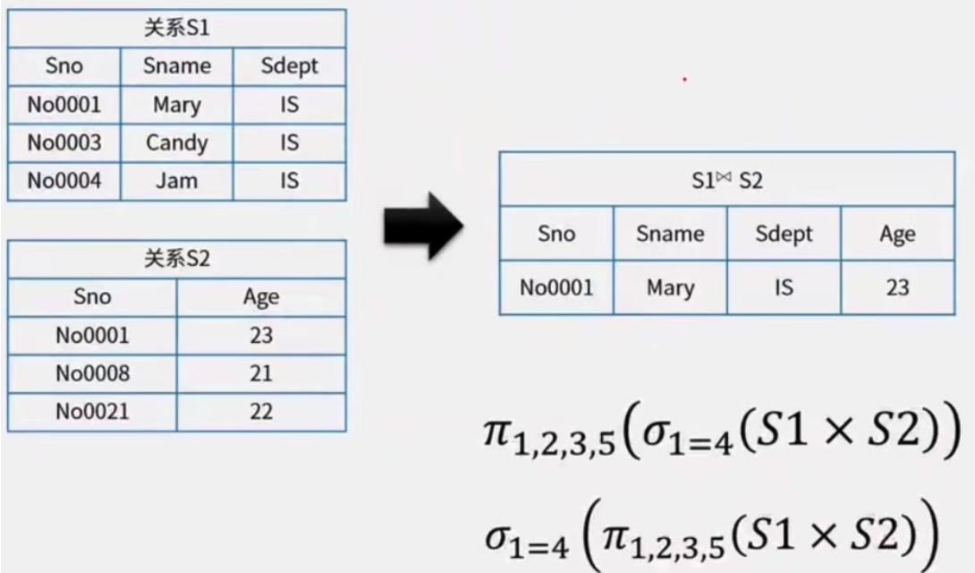 交(∩): 关系R与S的交是由属于R同时又属于S的元组的集合。