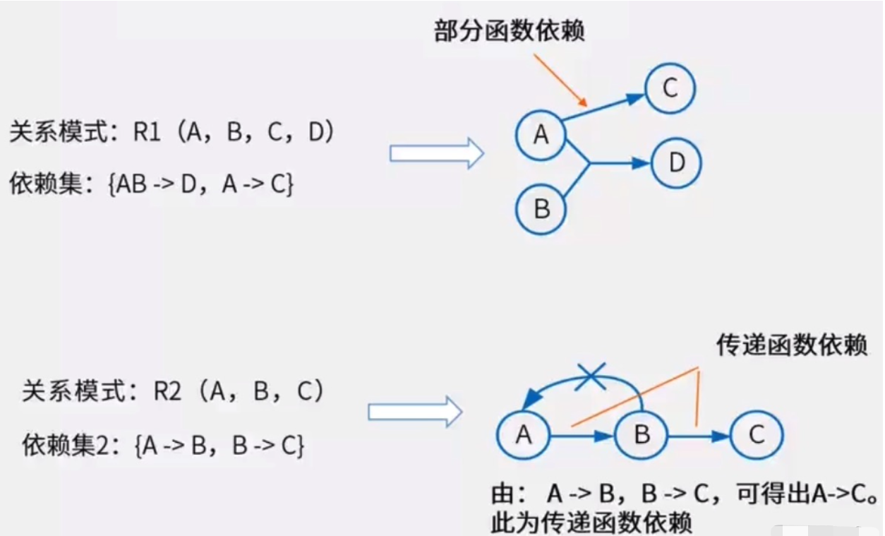 (3)第三范式(3NF):若关系模式R ∈ 2NF,且没有非主属性对主码的传递函数依赖。则关系模式R属于第三范式。
