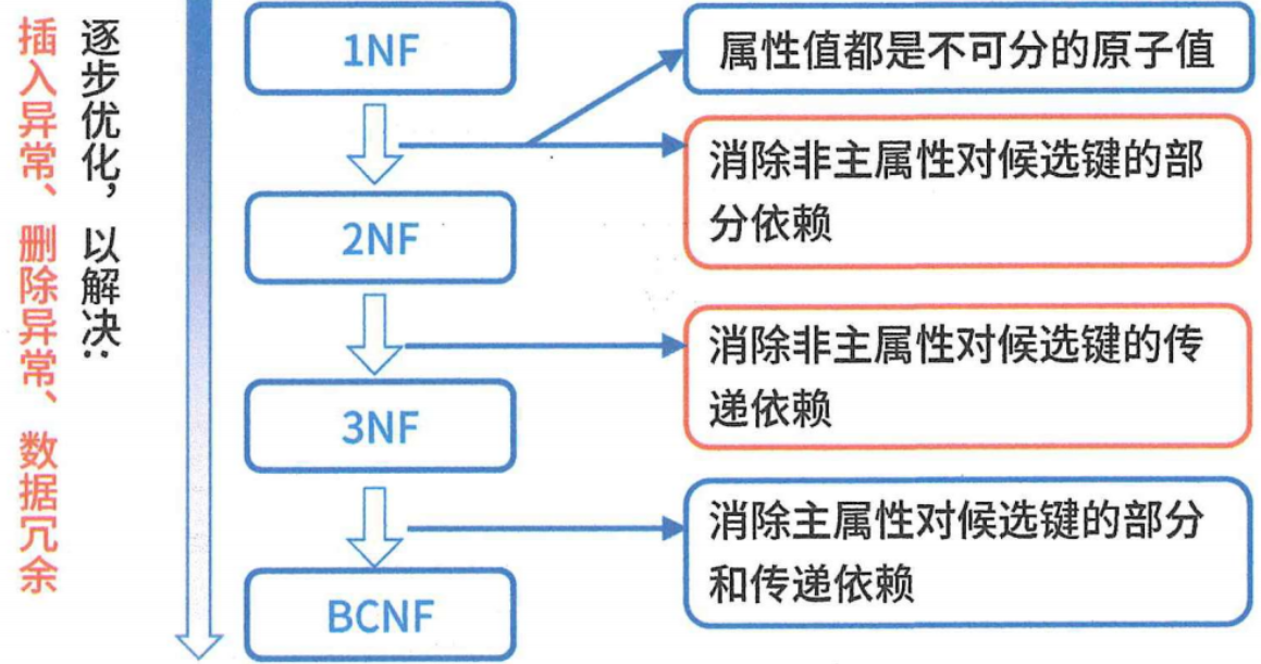 关系数据库设计的方法之一就是满足适当范式模式,通常可以通过判断分解后的模式达到几范式来评价模式的规范化程度。范式包括:1NF、2NF、3NF、BCNF、4NF、5NF。