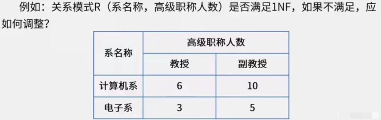 (1)第一范式(1NF):在关系模式R中,当且仅当所有域只包含原子值,既每个属性都是不可再分的数据项,则关系模式R属于第一范式。例如:以下不满足1NF,高级职称人数可以再分教授和副教授。