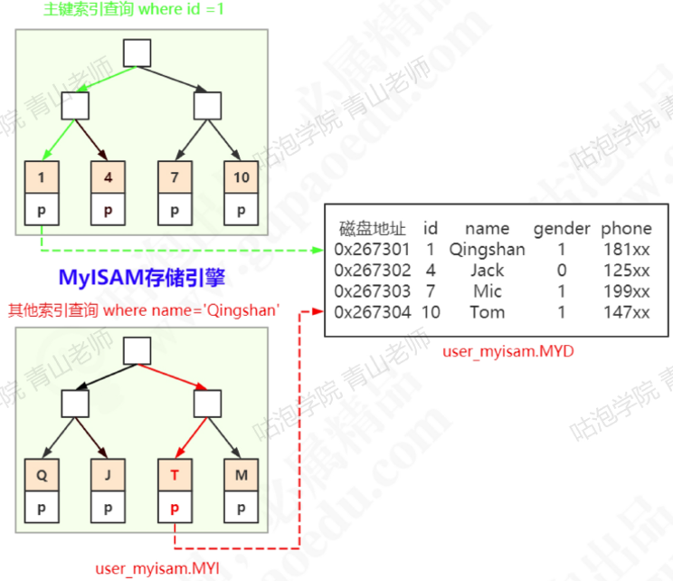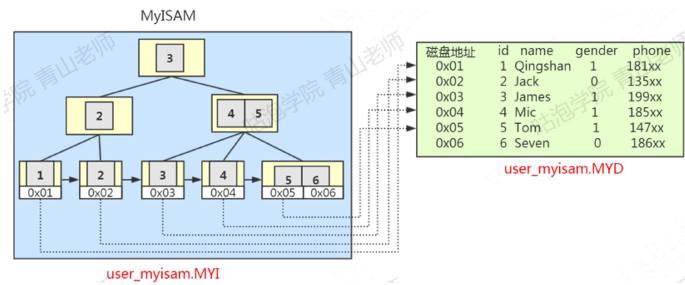 MyISAM的B+Tree中,叶子节点存储的是数据文件对应的磁盘地址。从索引文件中找到键值后,会到数据文件中获取相应的数据记录。