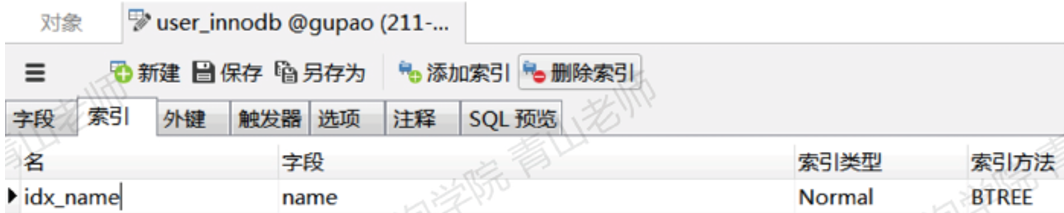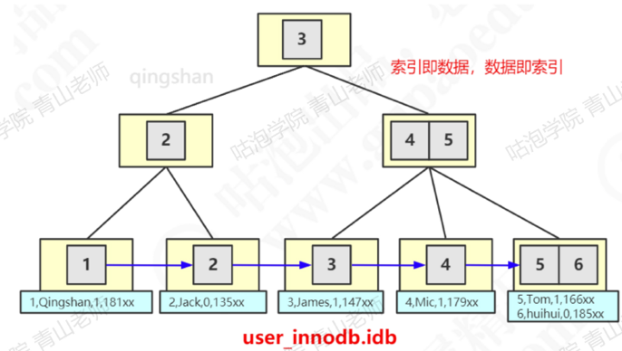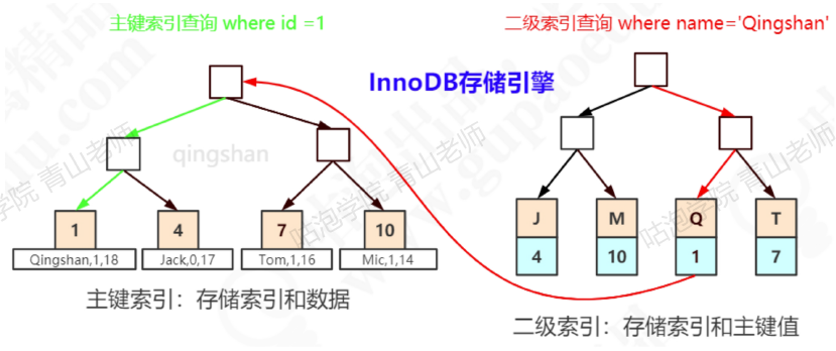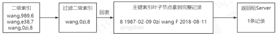 当我们用name索引查询一条记录,它会在二级索引的叶子节点找到name=qingshan,拿到主键值,也就是id=1,然后再到主键索引的叶子节点拿到数据。