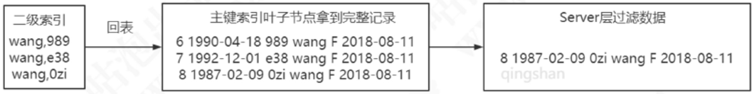 1)根据联合索引查出所有姓wang的二级索引数据(3个主键值6,7,8)