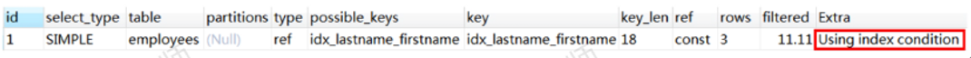 正常来说,因为字符是从左往右排序的,当你把%加在前面时,是不能基于索引去比较的,所以只有last_name这个字段能够用于索引比较和过滤。所以查询过程是这样的:
