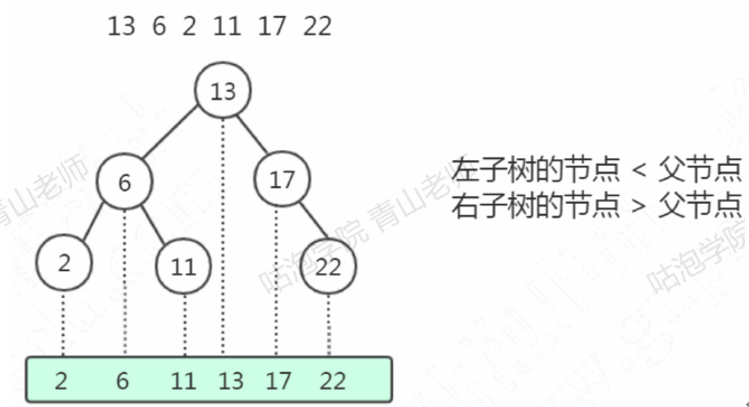 二叉查找树的特点:左子树节点都小于父节点,右子树节点都大于父节点。投影到平面就是一个有序的线性表。