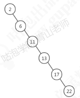 二叉查找树既能够实现快速查找,又能实现快速插入,但是它有个问题:它的查找耗时是和这棵树的深度相关的,在最坏的情况下时间复杂度会退化成O(n)。还是刚才这一批数字,如果插入的数据刚好是有序的,它就会变成链表(斜树),这种情况下不能达到加快检索速度的目的,和顺序查找效率是没有区别的。
