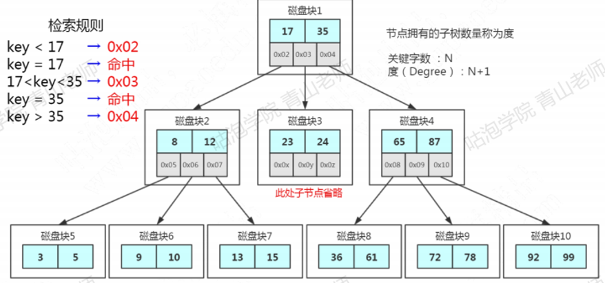 比如要找15:因为15<17,走左边;15>12,走右边,在磁盘7里找到了15,只用了3次IO。