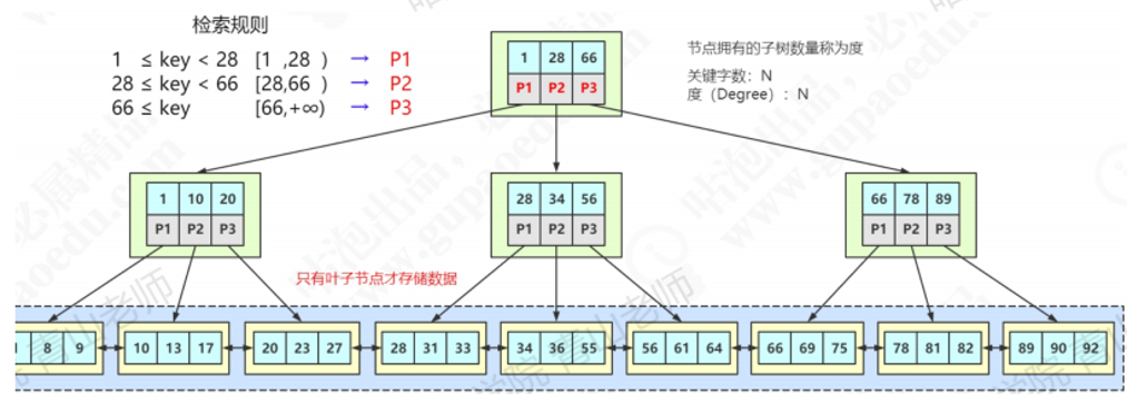 2.B+树的根节点和枝节点都不会存储数据,只有叶子节点才存储数据,搜索到关键字不会直接返回,会到最后一层的叶子节点才会返回数据。