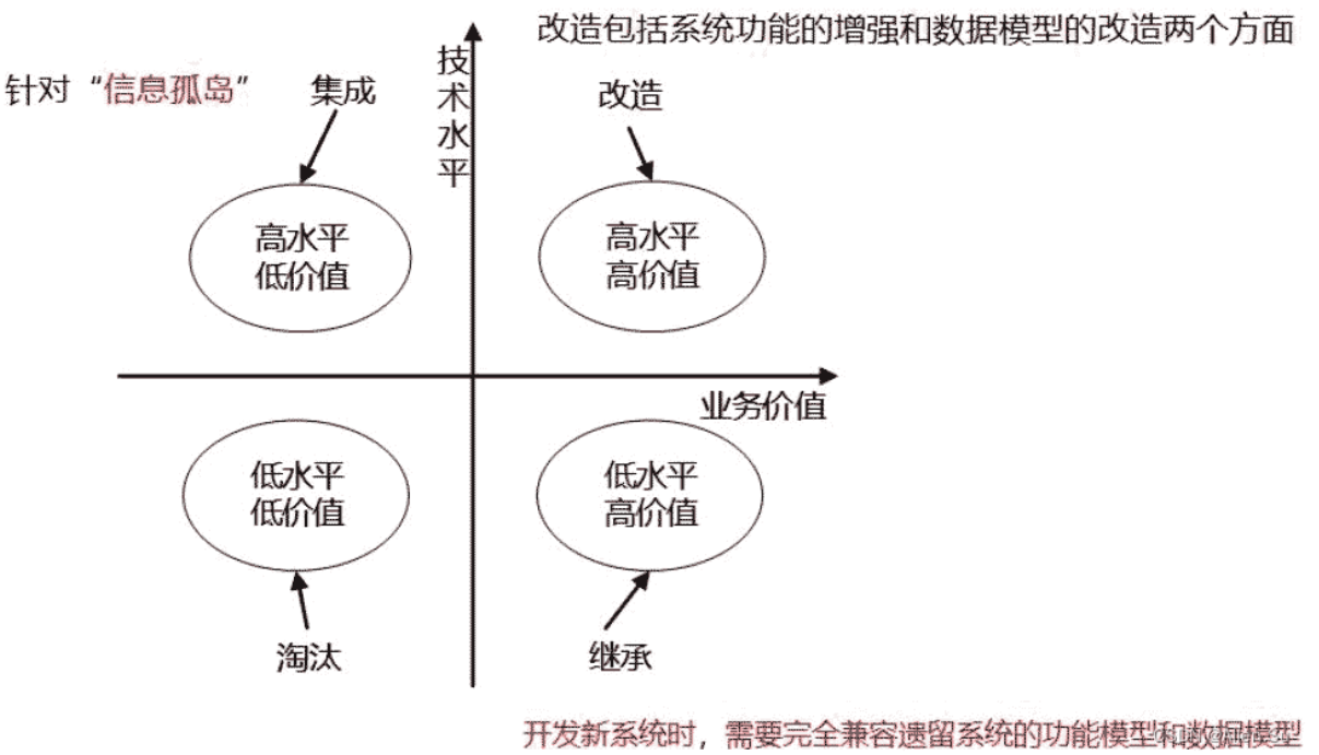 - 集成策略,高水平、低价值区,即遗留系统的技术含量较高,但其业务价值较低,可能只完成某个部门(或子公司)的业务管理。这种系统在各自的局部领域里工作良好,但对于整个企业来说,存在多个这样的系统,不同的系统基于不同的平台、不同的数据模型,形成了一个个信息孤岛,对这种遗留系统的演化策略为集成。