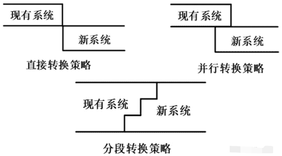 - 直接转换策略,适用于新系统不太复杂或现有系统完全不能使用的场合,新系统在转换之前必须经过详细而严格的测试。