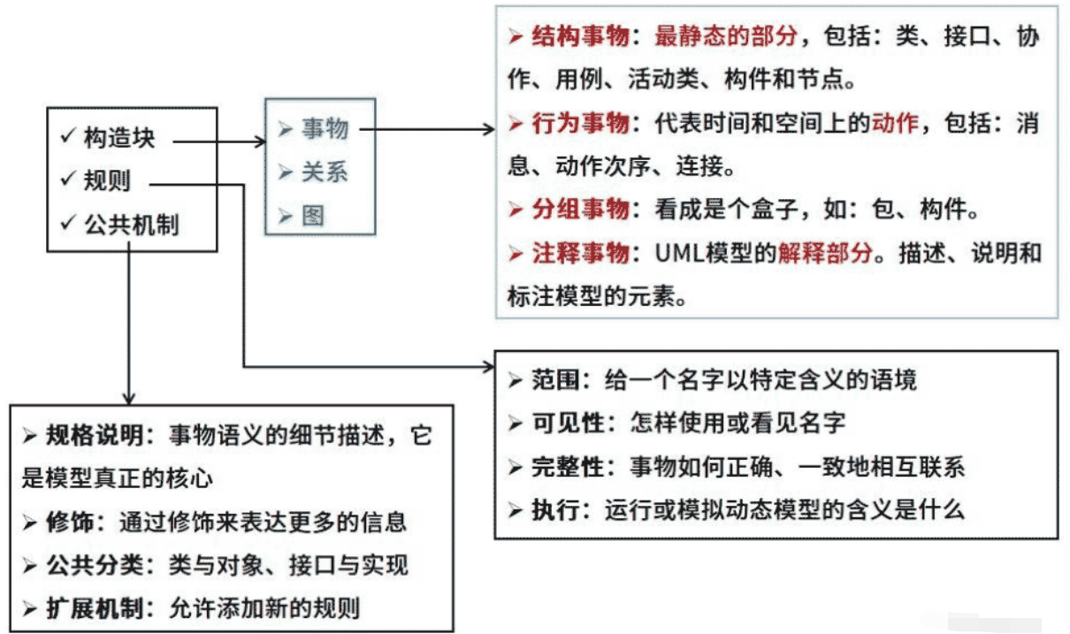 是构造块如何放在一起的规定,包括为构造块命名;给一个名字以特定含义的语境,即范围;怎样使用或看见名字,即可见性;事物如何正确、一致地相互联系,即完整性;运行或模拟动态模型的含义是什么,即执行。