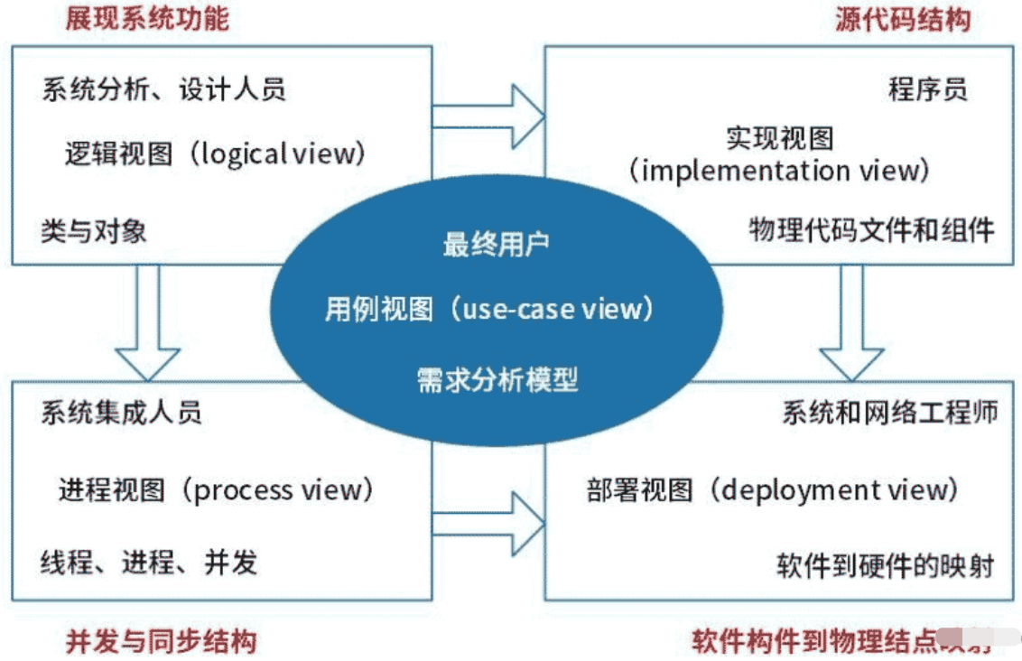 UML采用4+1视图来描述软件和软件的开发过程,其中进程视图绘制了所设计的并发与同步结构;部署视图表示软件到硬件的映射和分布结构;UML中的类图可以用来表示4+1视图中逻辑视图;最终形成用例视图,用来得到需求分析模型。