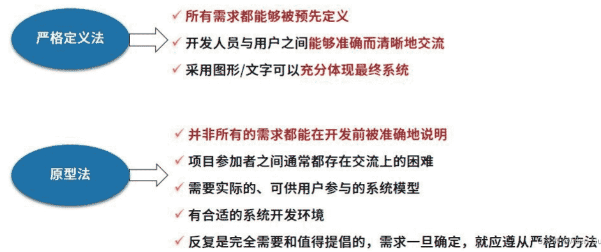 需求定义的过程也就是形成需求规格说明书SRS的过程,通常有两种需求定义的方法,分别是严格定义方法和原型方法。